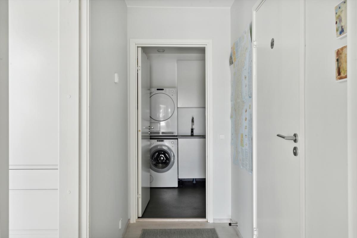 Tvättstuga/groventré med kapphänge och skåp. Här finns tvättmaskin, torktumlare, tvättho, helautomatisk vattenrening och markvärmepump. Våtrumsmatta.