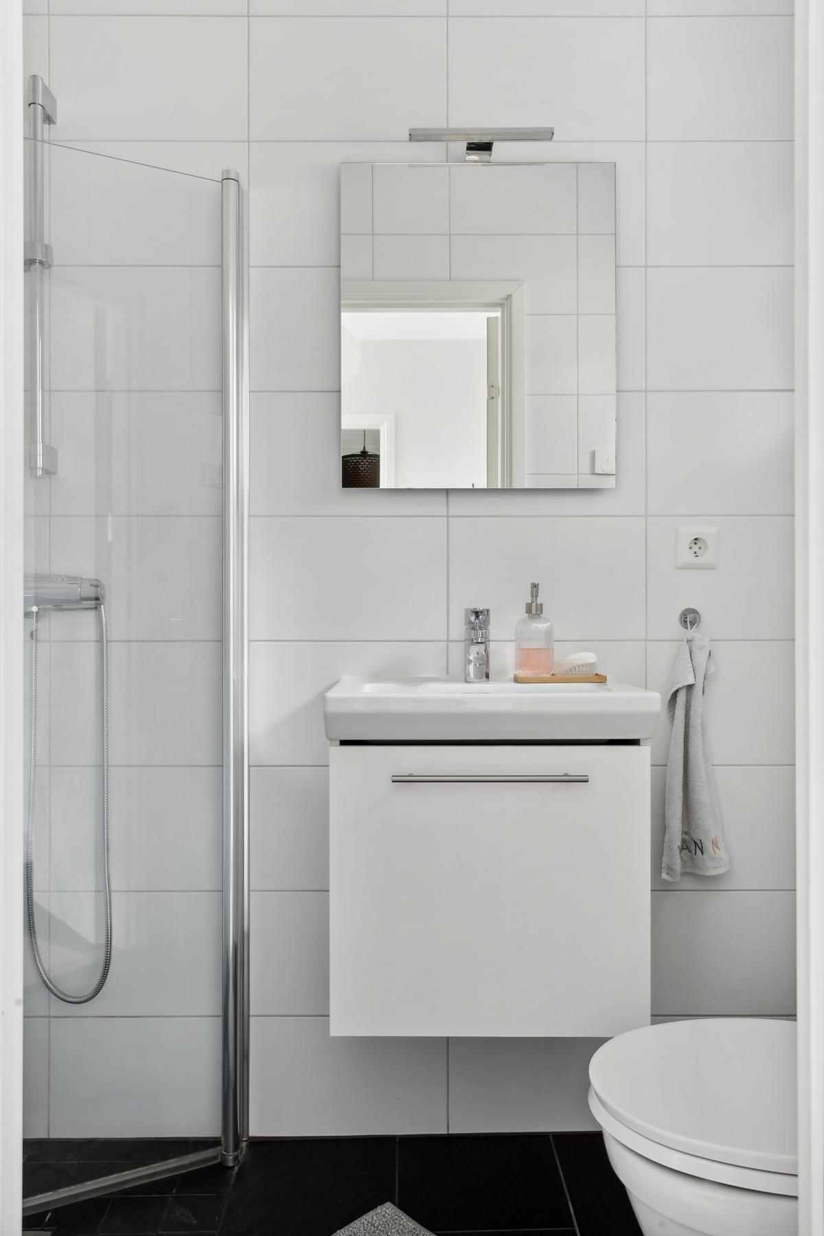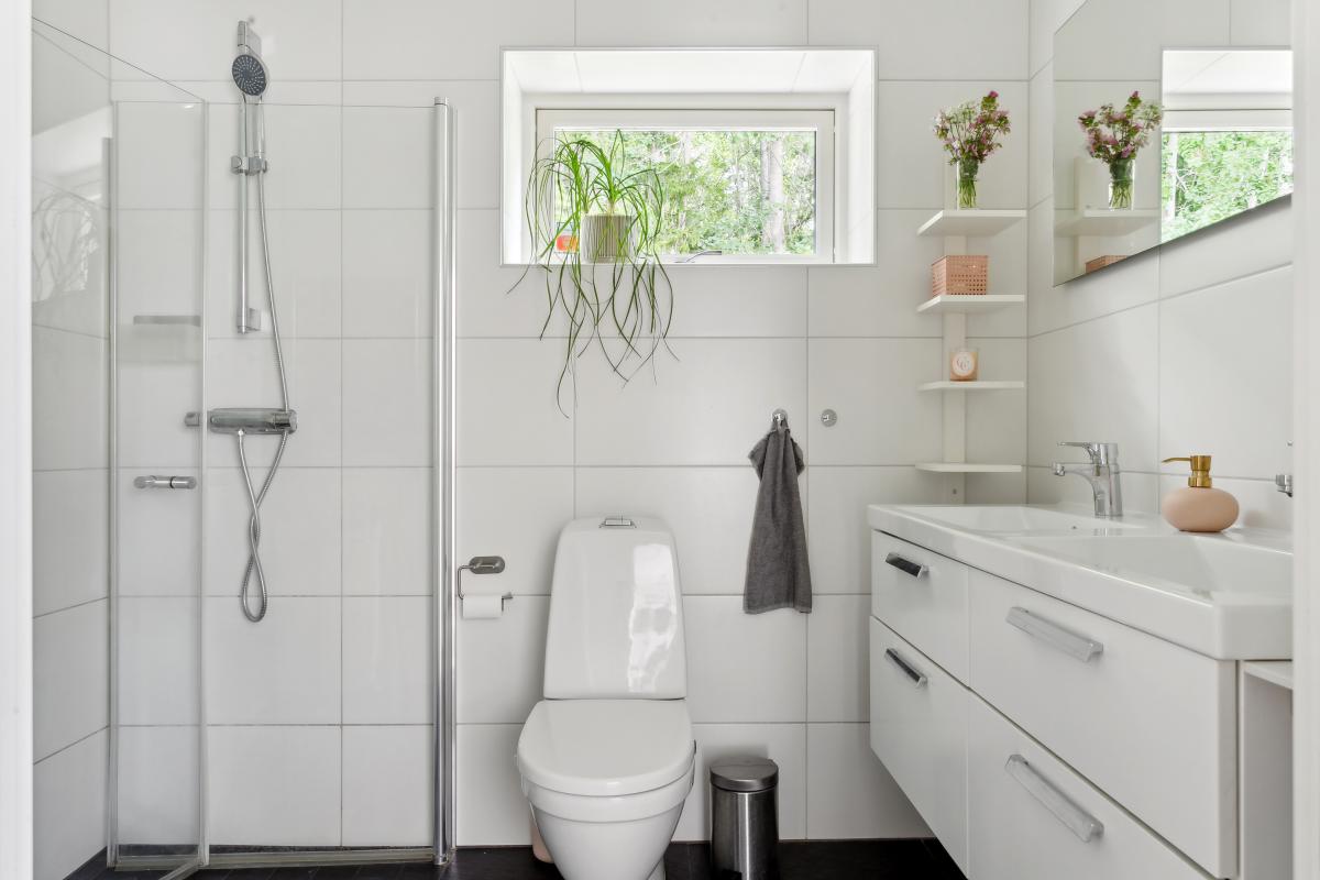 Rymligt helkaklat badrum med klinkergolv och golvvärme. Vädringsfönster. Utrustning: dubbelkommod, wc, dusch och handdukstork.
