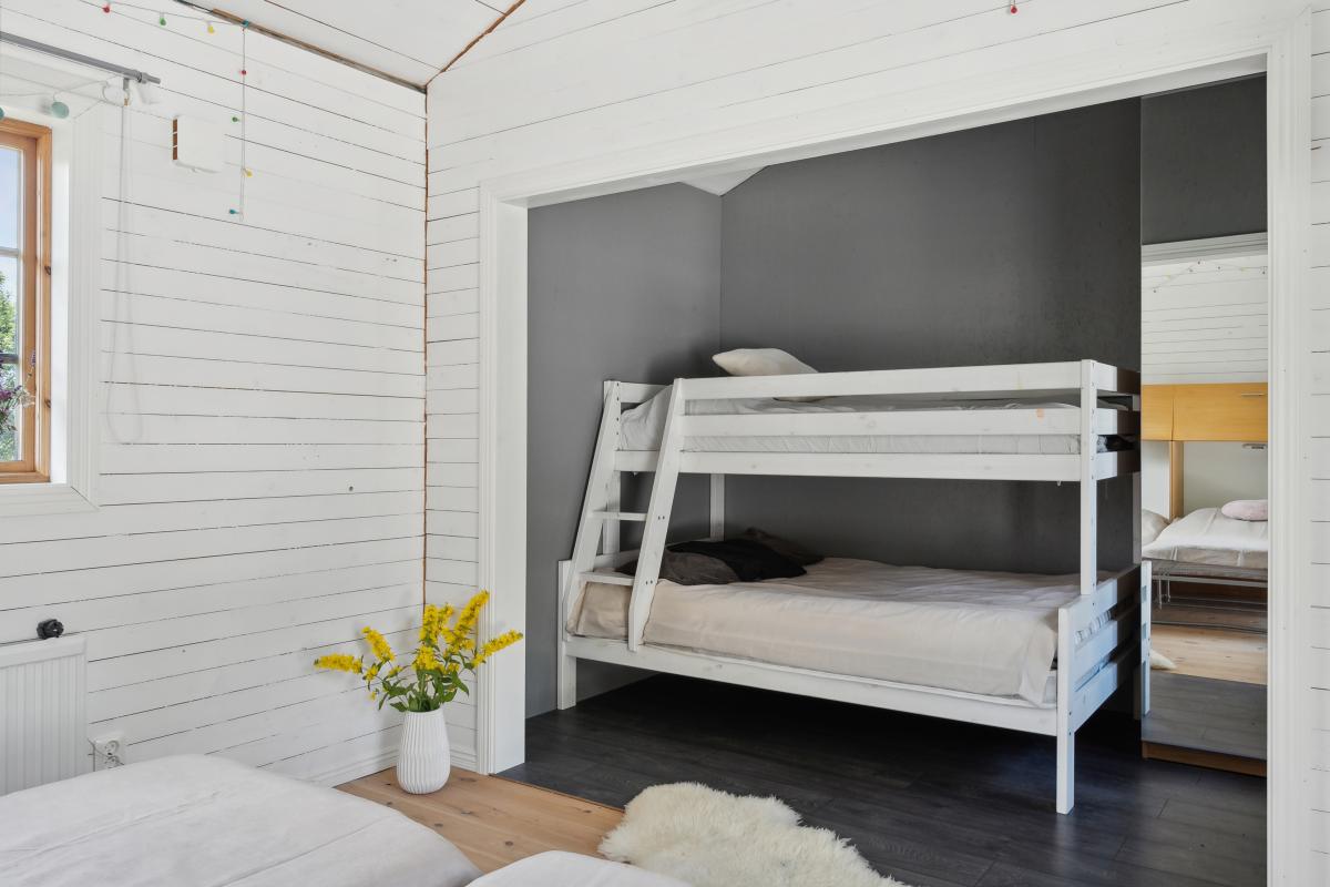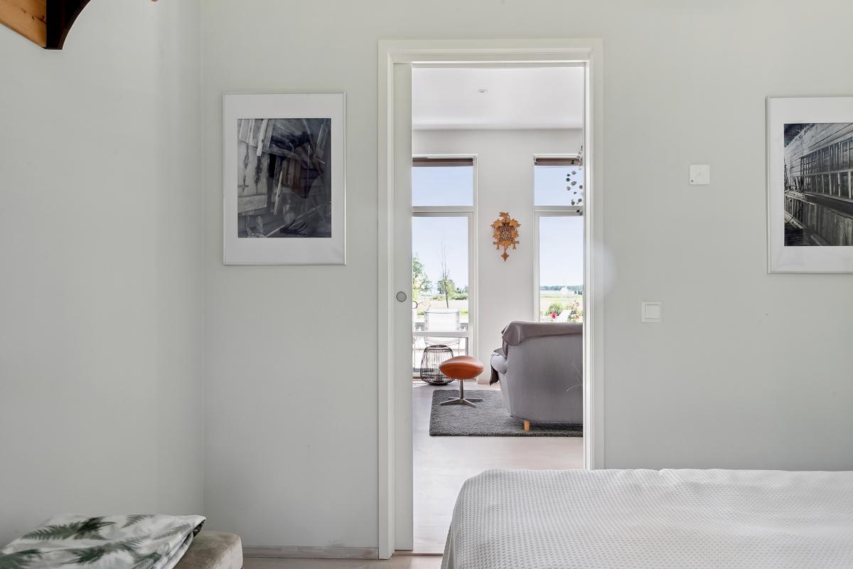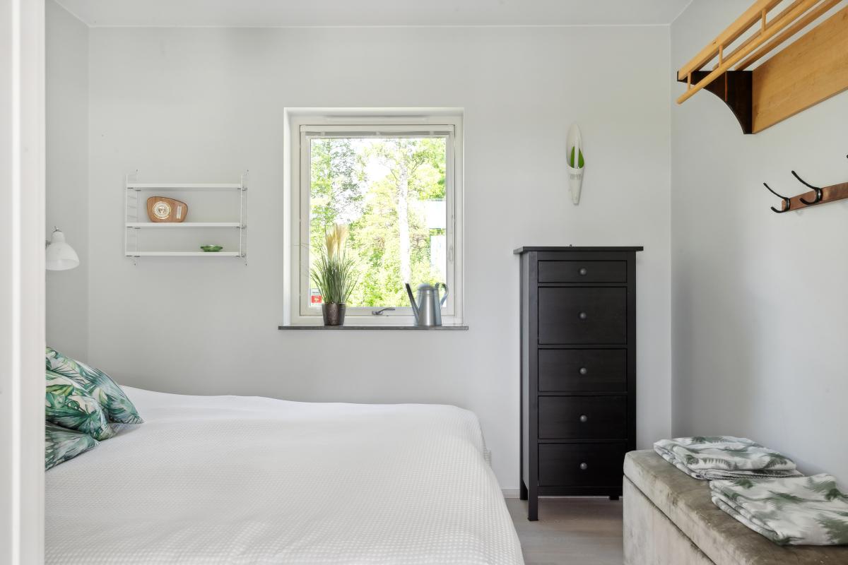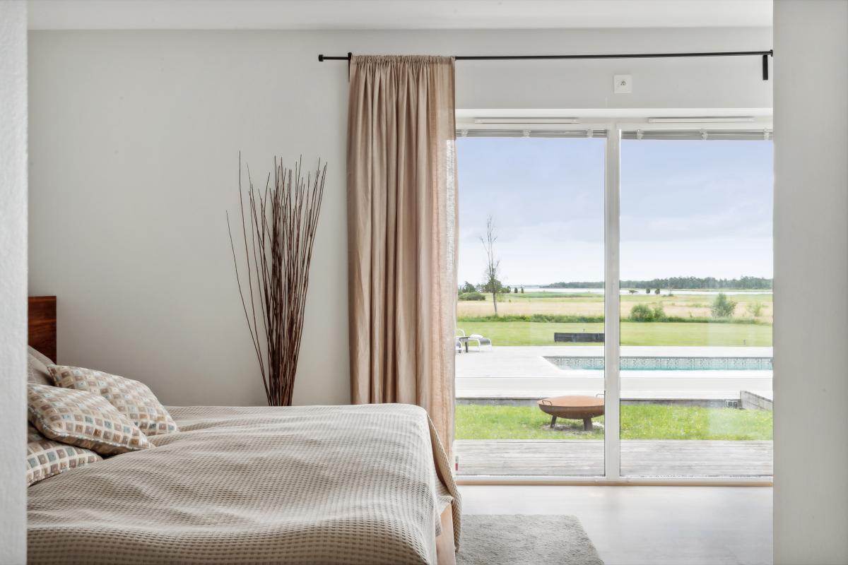 Stort sovrum med mindre gavelfönster och två stora fönster ned till golv med hänförande utsikt. Utgång till altan via fönsterdörr.