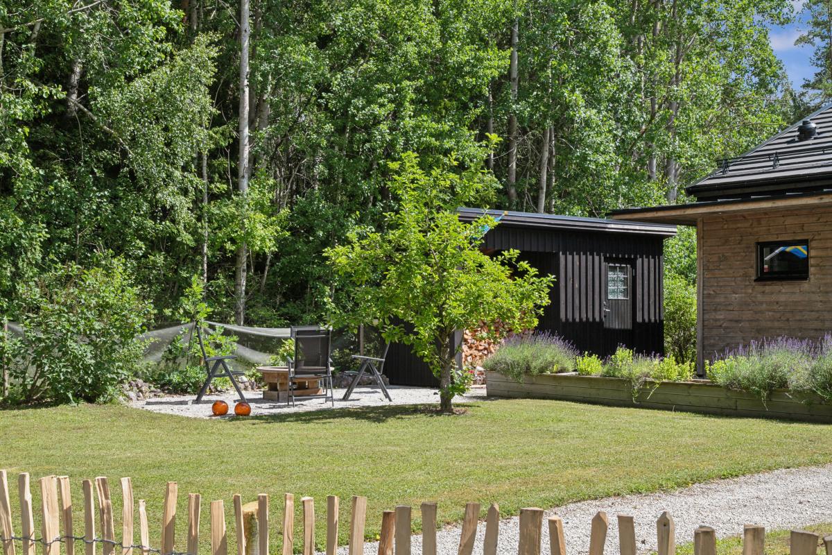 Charmig och fin gäststuga om ca 15 kvm med plats för 4 sängar. Stugan är renoverad 2009, isolerad och har oljefyllda elelement. Intill stugan ligger ett mindre hus. Bägge husen är i trä och har plåttak. Vid bostadshuset finns ett praktiskt förråd med separat vedförråd (trä med plåttak). På tomten finns även en gjuten platta på 36 kvm som är förberedd för el och v/a. Den används idag som bar/utekök men planer fanns tidigare på ett gästhus.