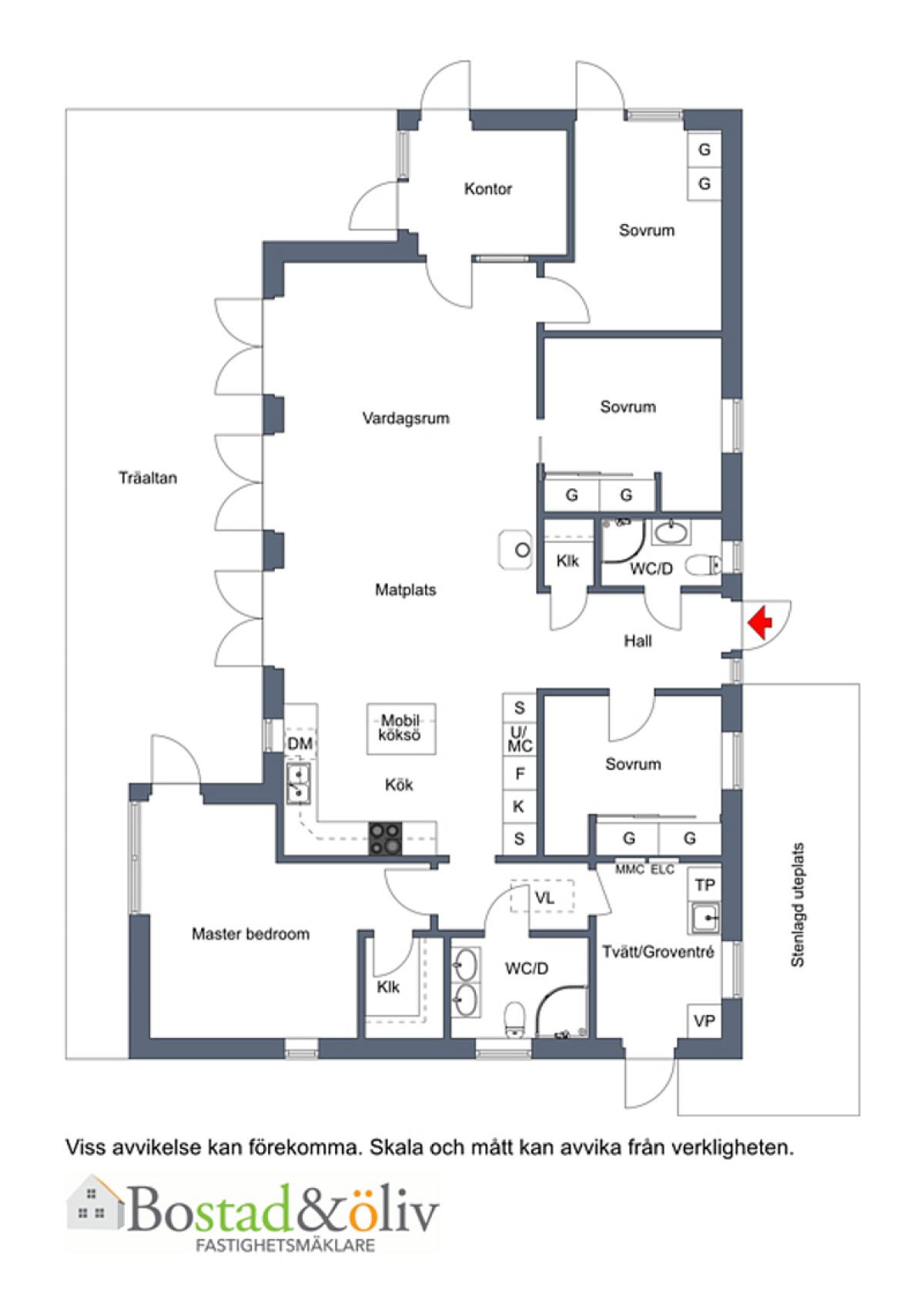 Samtliga areauppgifter är hämtade från fastighetsregistret eller baserade på säljarens information. Dessa uppgifter kan av olika anledningar vara fel. Den köpare som tycker att arean har betydelse för köpet bör därför vidta en uppmätning.