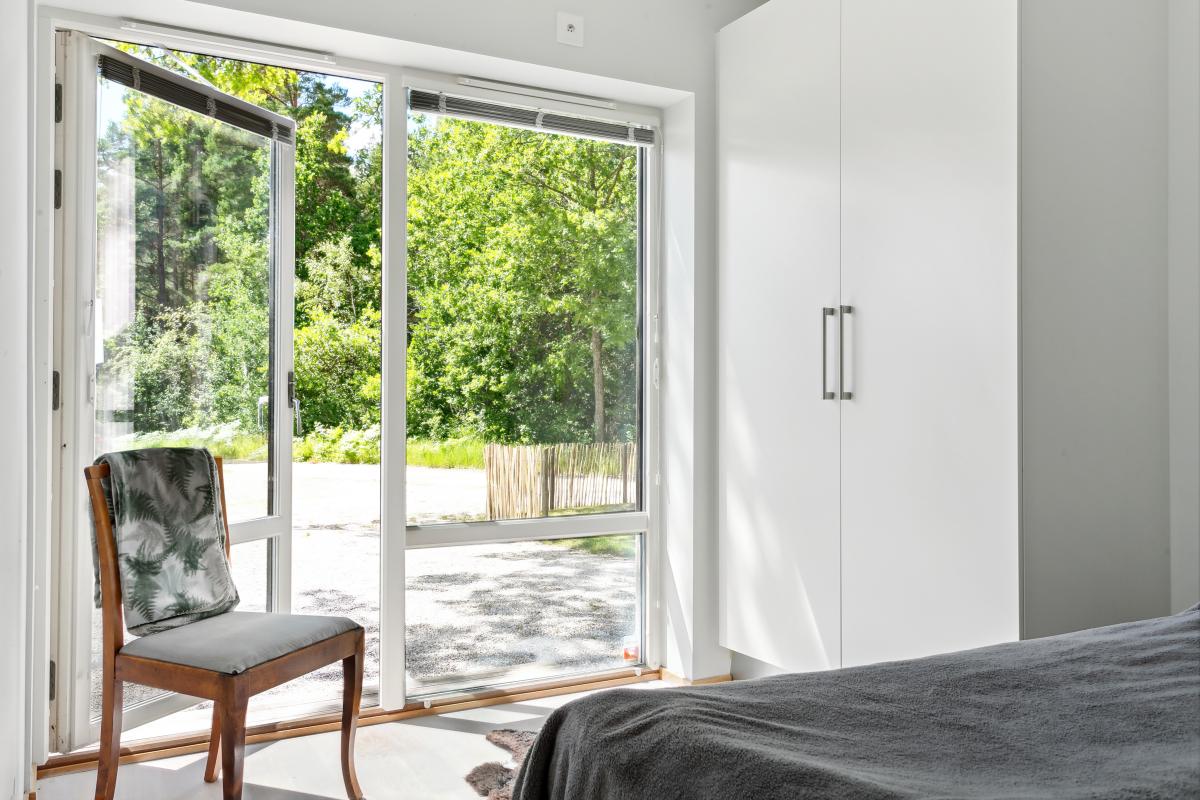 Rymligt sovrum med dubbelgarderob. Stort fönster ned till golv och fönsterdörr.
