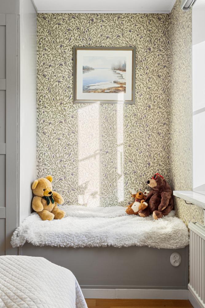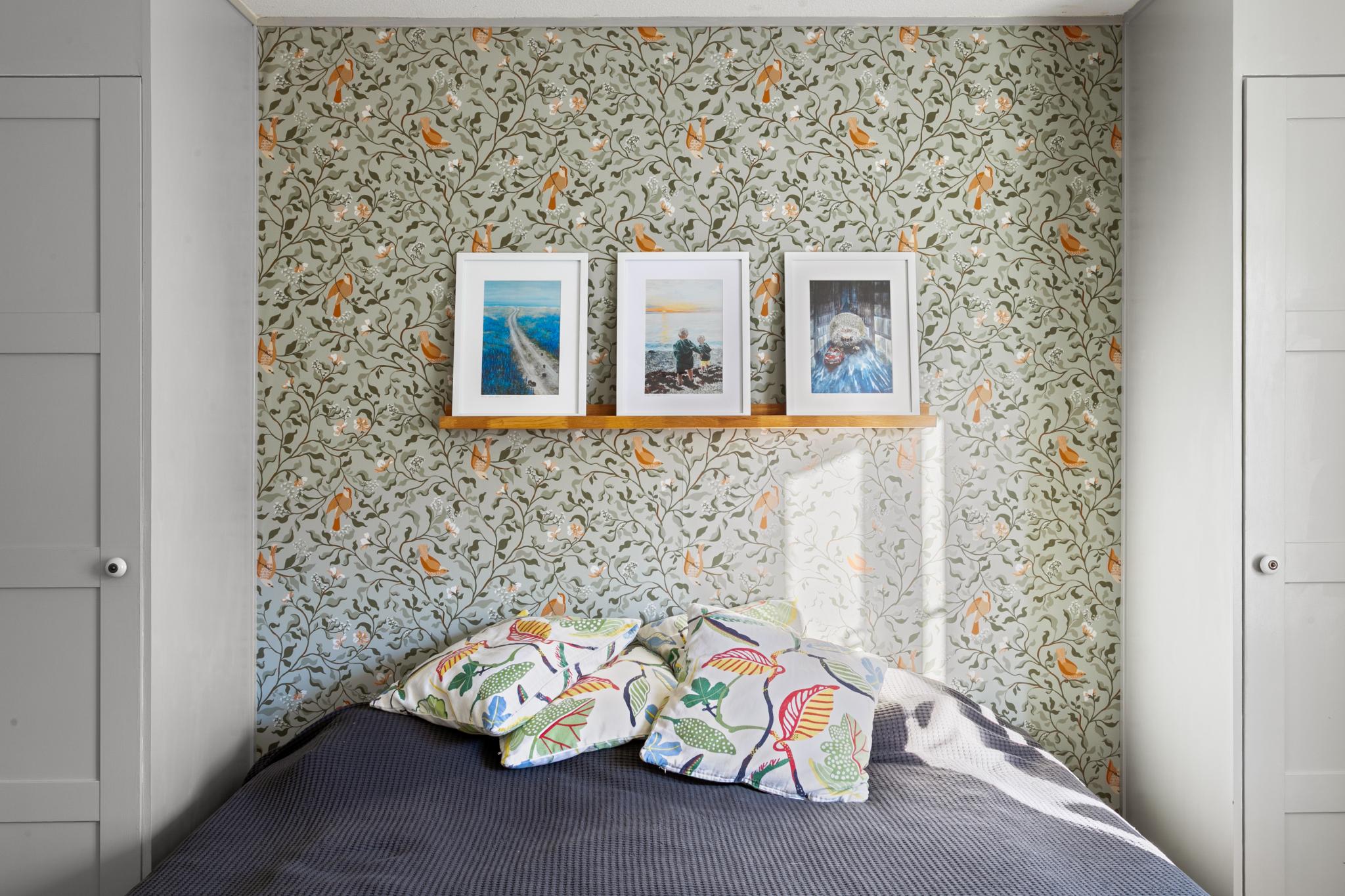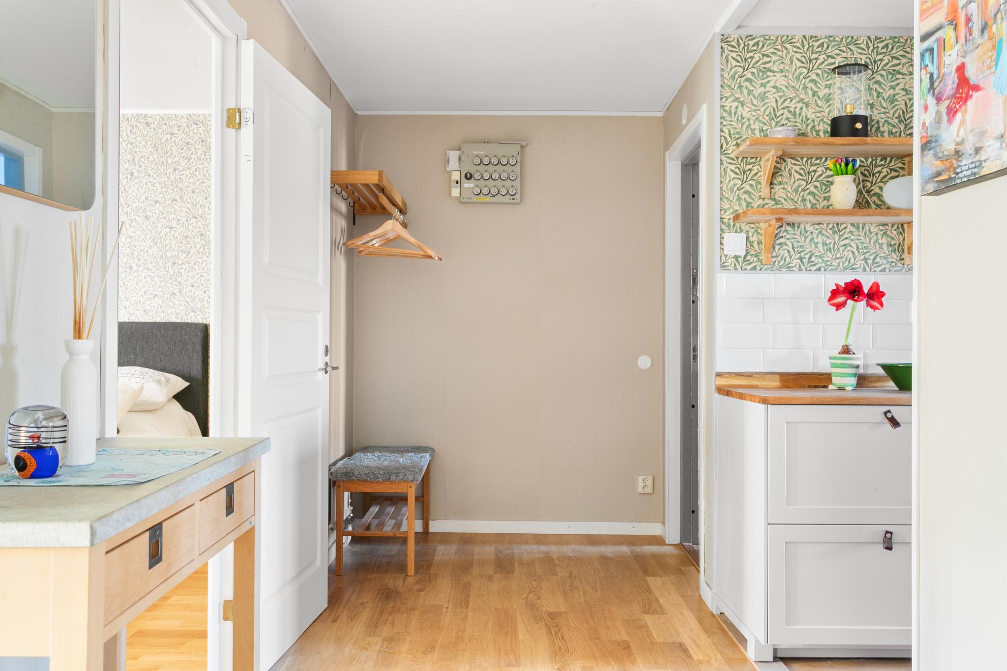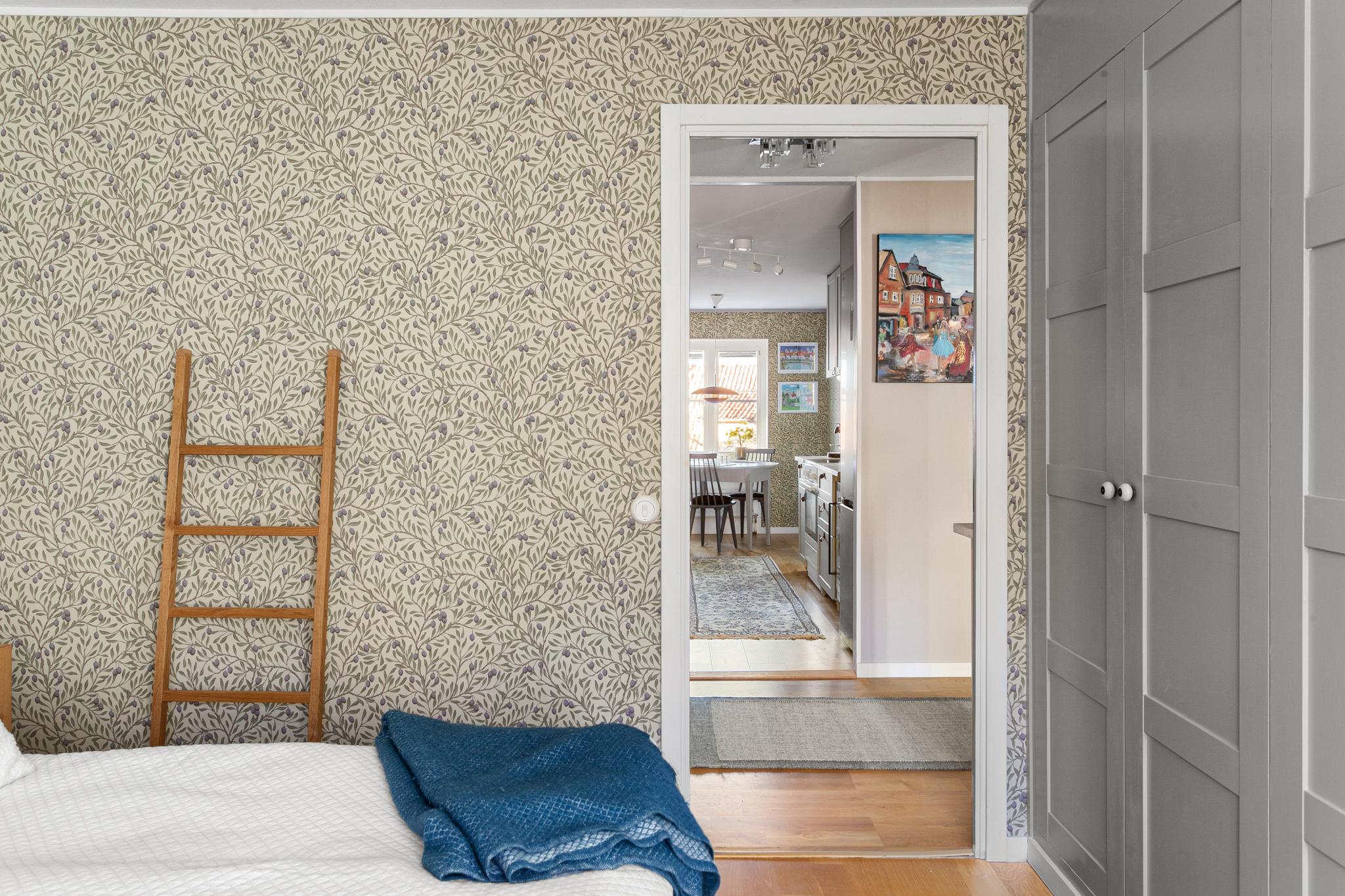 Till höger efter du hängt av dina ytterkläder ligger lägenhetens första sovrum. Rummet har trägolv, bra förvaring i fyra garderober och ett fönster mot föreningens gård i öst.