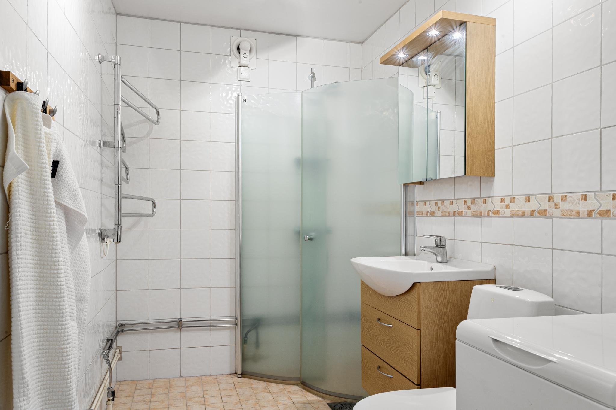 Helkaklat badrum med golvvärme. Dusch med vikbara duschväggar, badrumsskåp och handfat med kommod. Tvättmaskin.