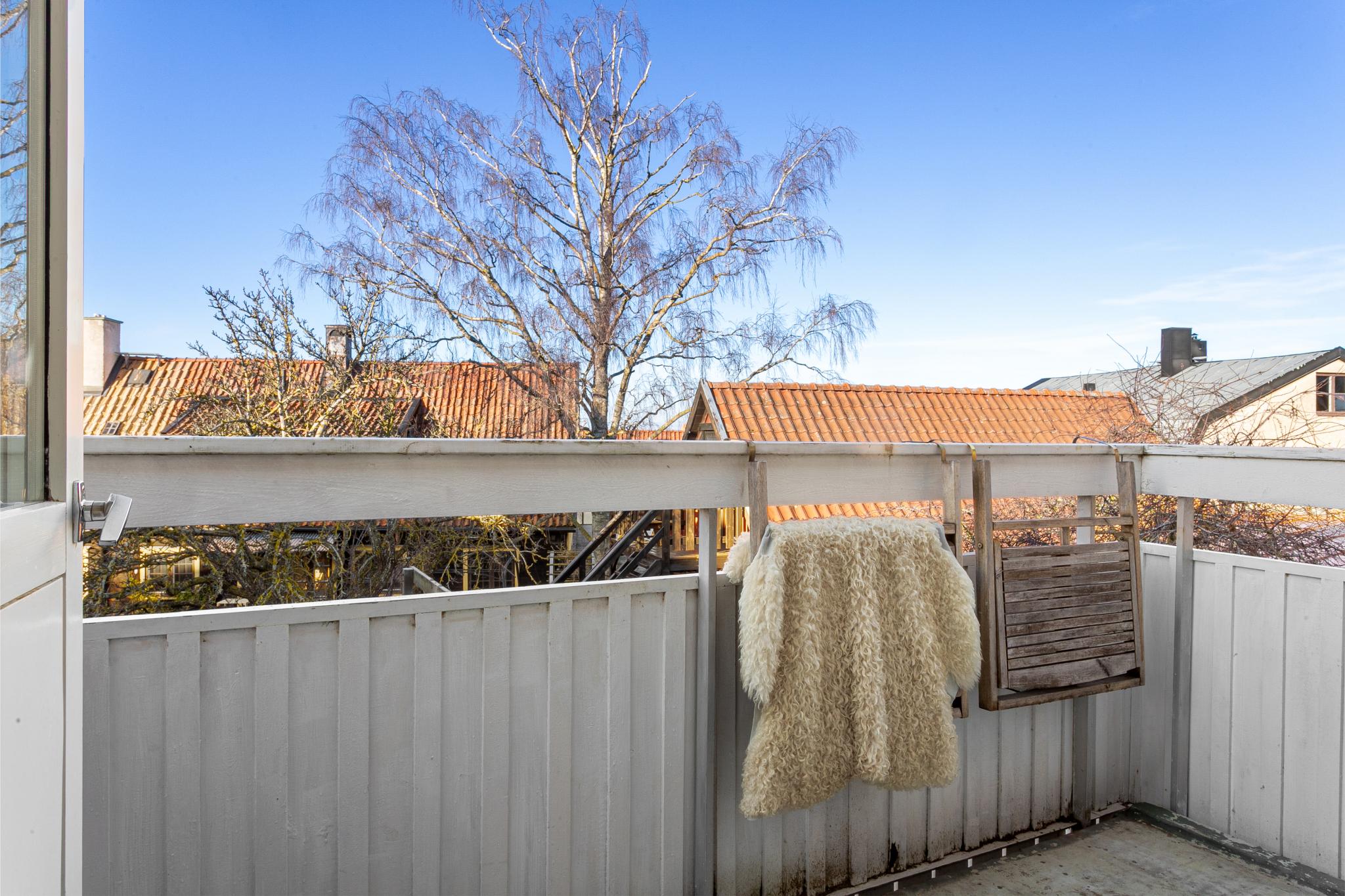 Med solvänligt och skyddat läge ligger lägenhetens sköna balkong. Här har du vy över föreningens fina innergård och över hustaken intill. Markis att skydda sig under när solen värmer som bäst.