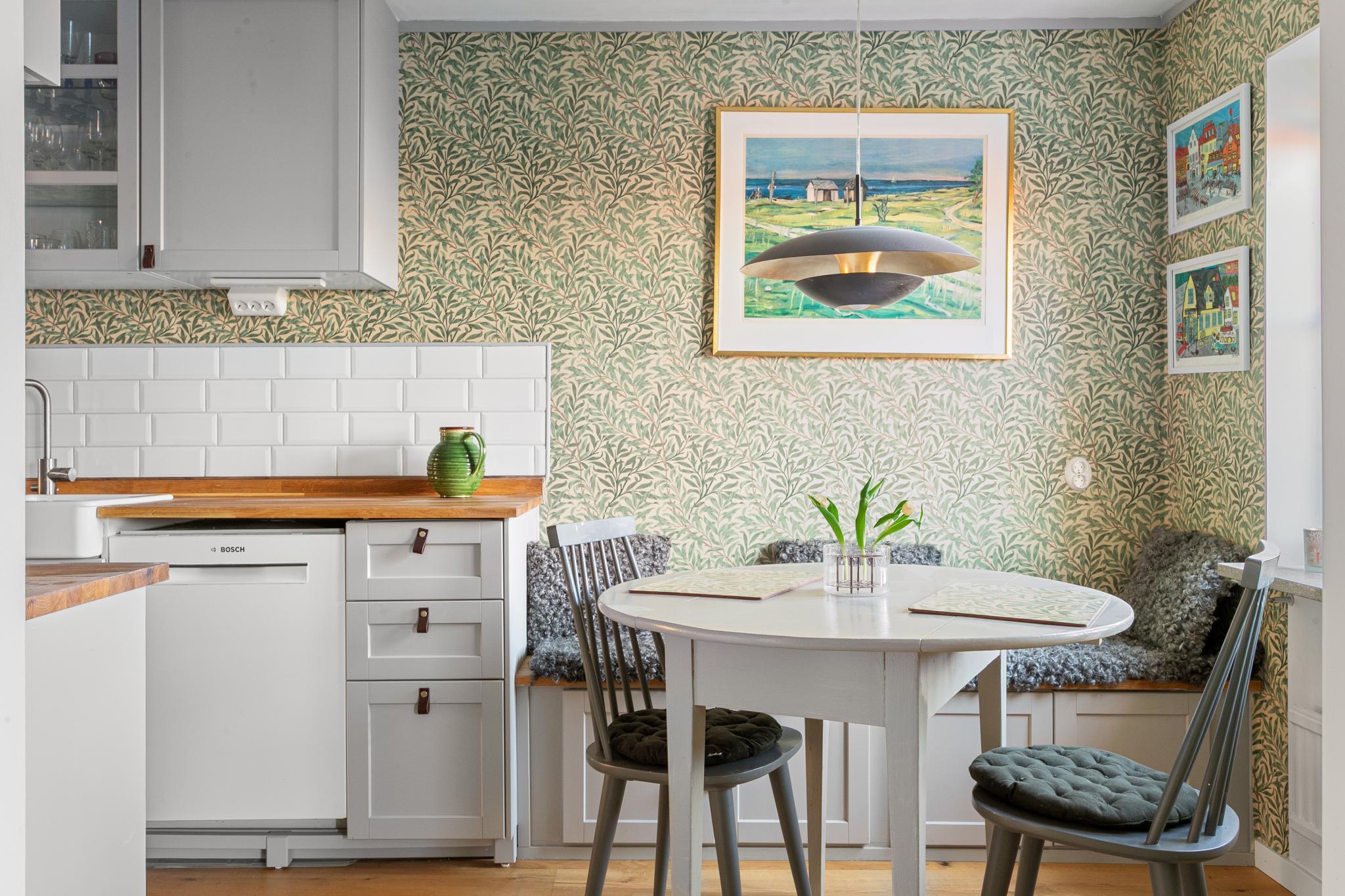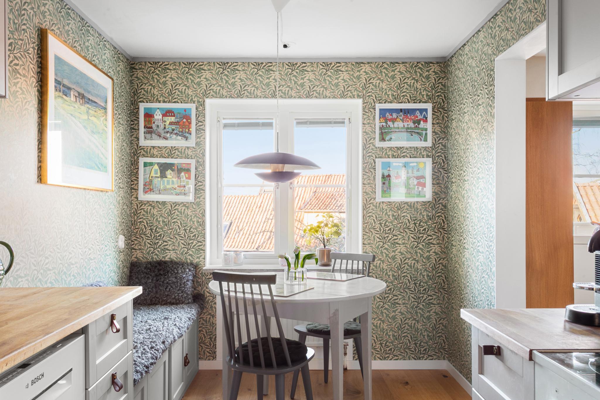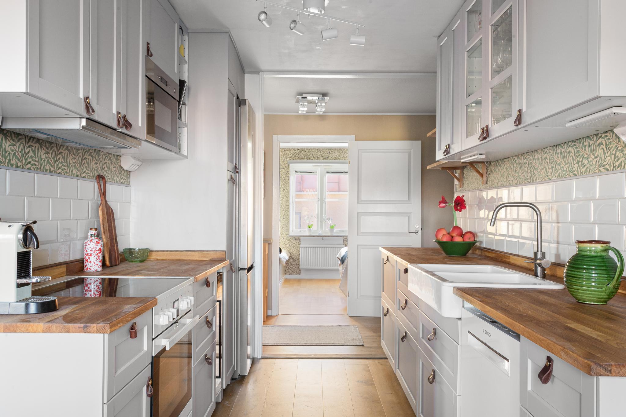 Smakfullt och välplanerat kök från 2024. Modernt utrustat med bl a inbyggd mikro, spis med häll, ugn, fläkt, kombinerad kyl&frys, diskmaskin samt vinkyl. Trivsam matplats vid fönster mot innergården.