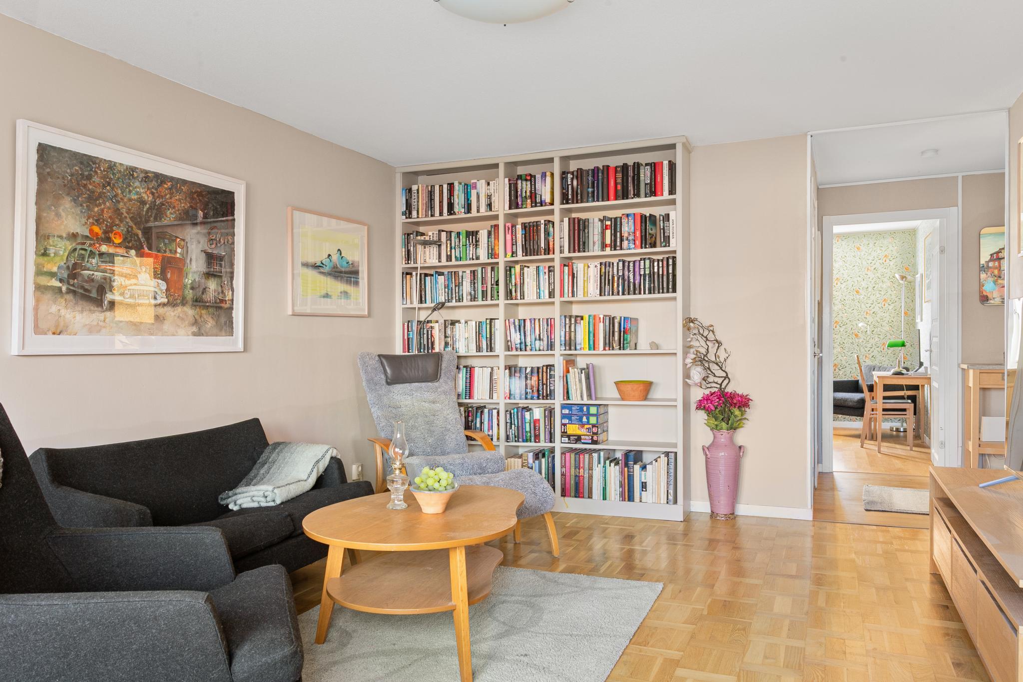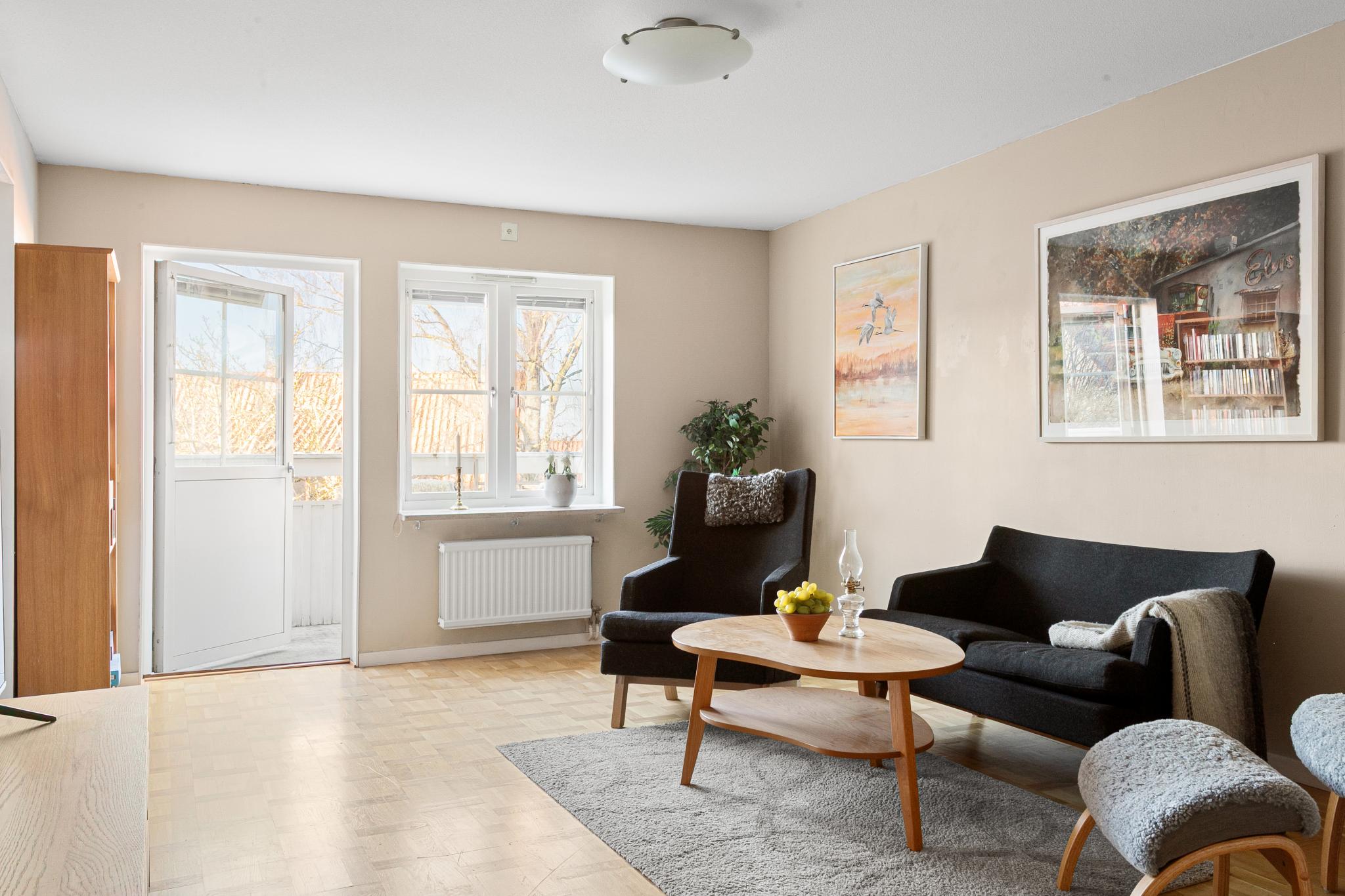 Rymligt vardagsrum med parkettgolv och öppning mot köket. Fönster och utgång till den egna balkongen.
