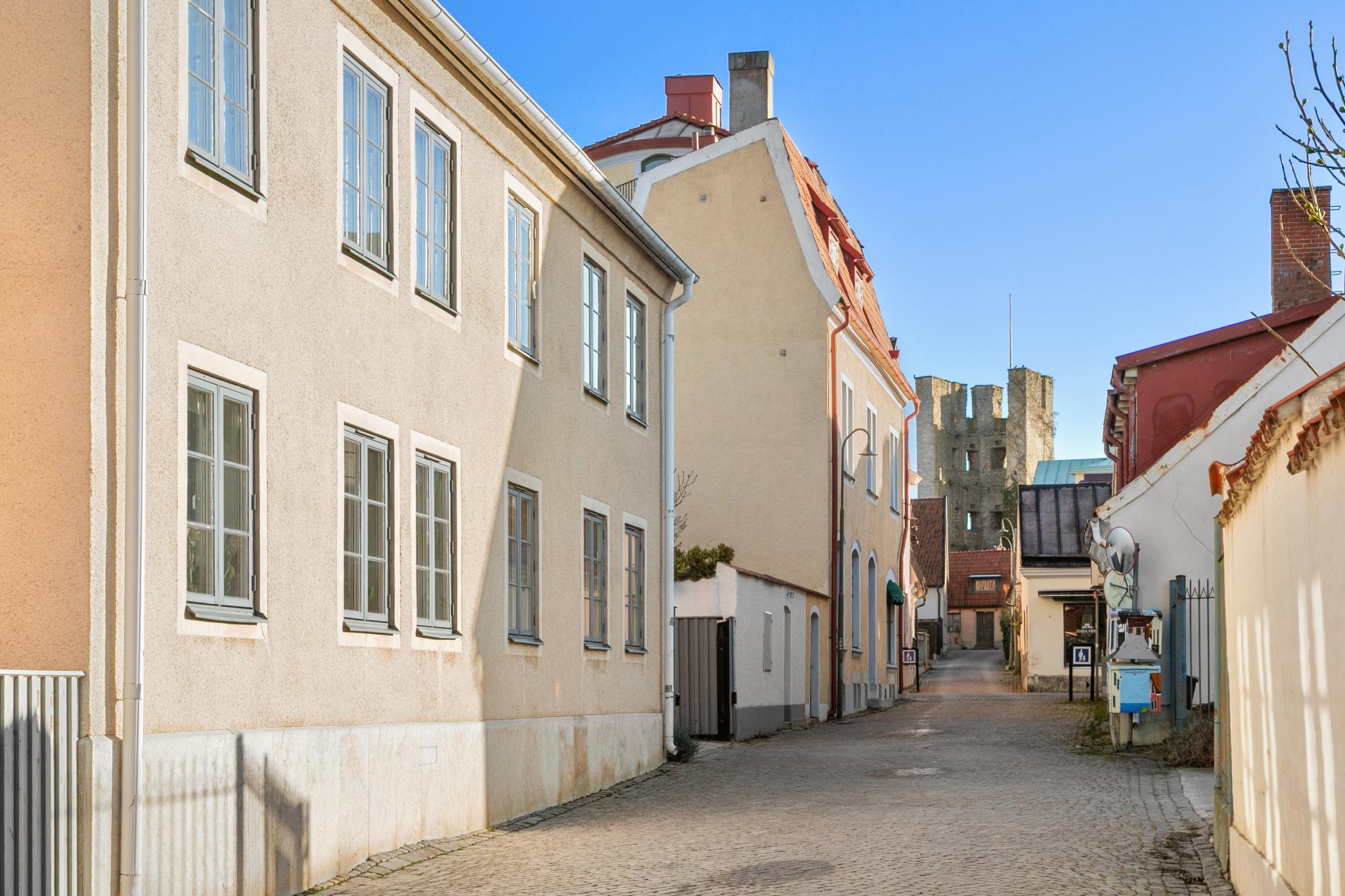 Visby innerstad har en fantastisk miljö och atmosfär. Här finns små smala gränder, vackra byggnader, restauranger, butiker, caféer, Visby Domkyrka och flertalet välhållna och fina ruiner. Hamnområdet med Almedalen, Uppsala Universitet/Campus Gotland och Visby Strand når du på några korta minuters promenad genom Visbys gränder. Närheten till affärsutbudet på Östercentrum samt populära Ica Torgkassen gör läget centralt och lättillgängligt samtidigt som det inte är stört av vare sig trafik eller "gångstråk".
