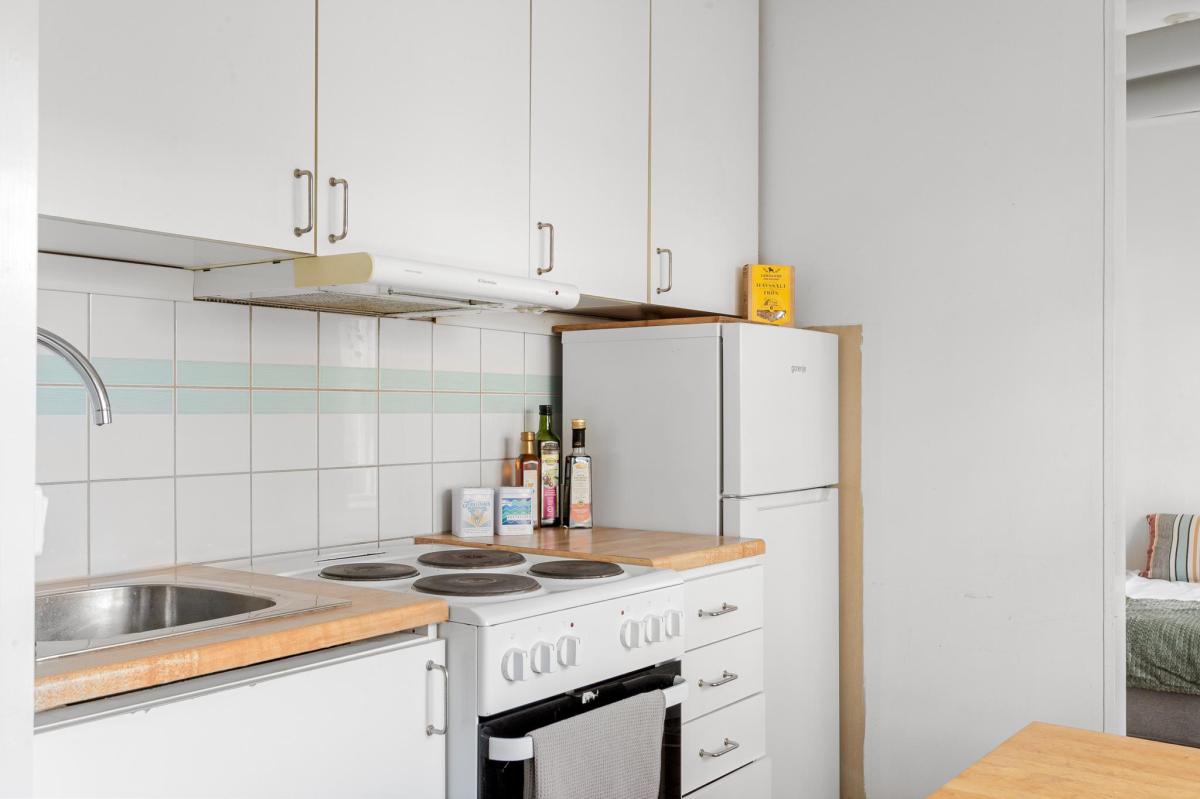 Köket är utrustat med spis med plattor och ugn, fläkt, kylskåp med frysfack samt diskho. Matplats vid fönster.
