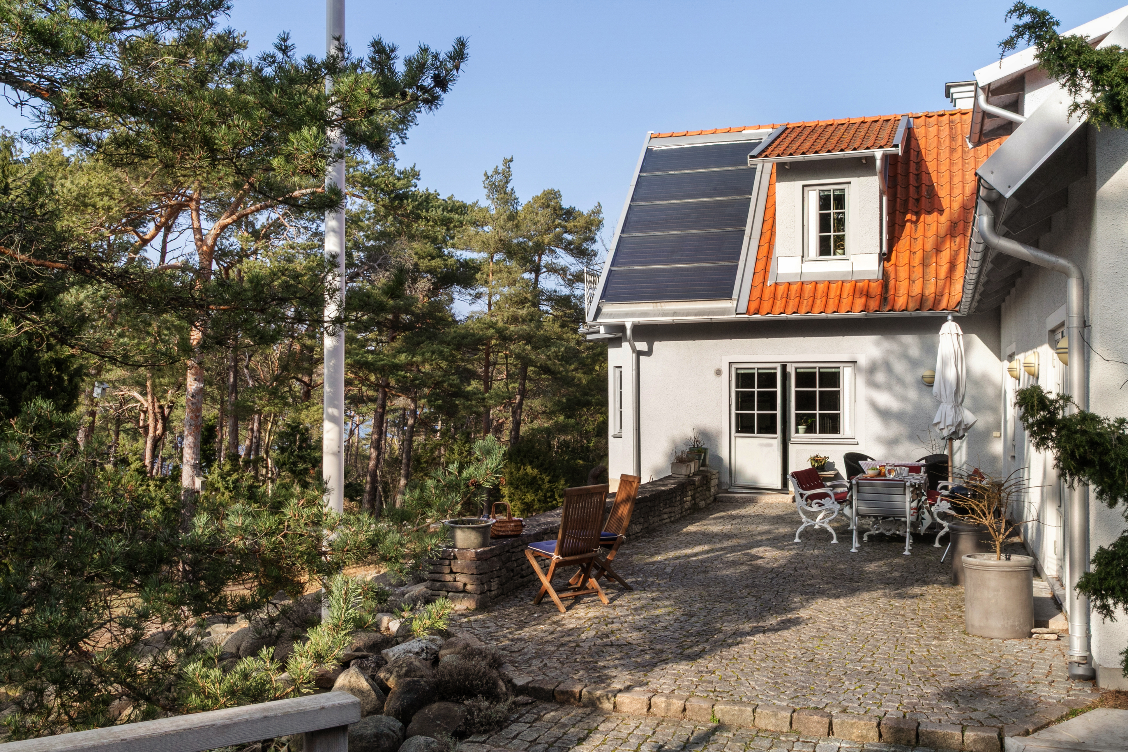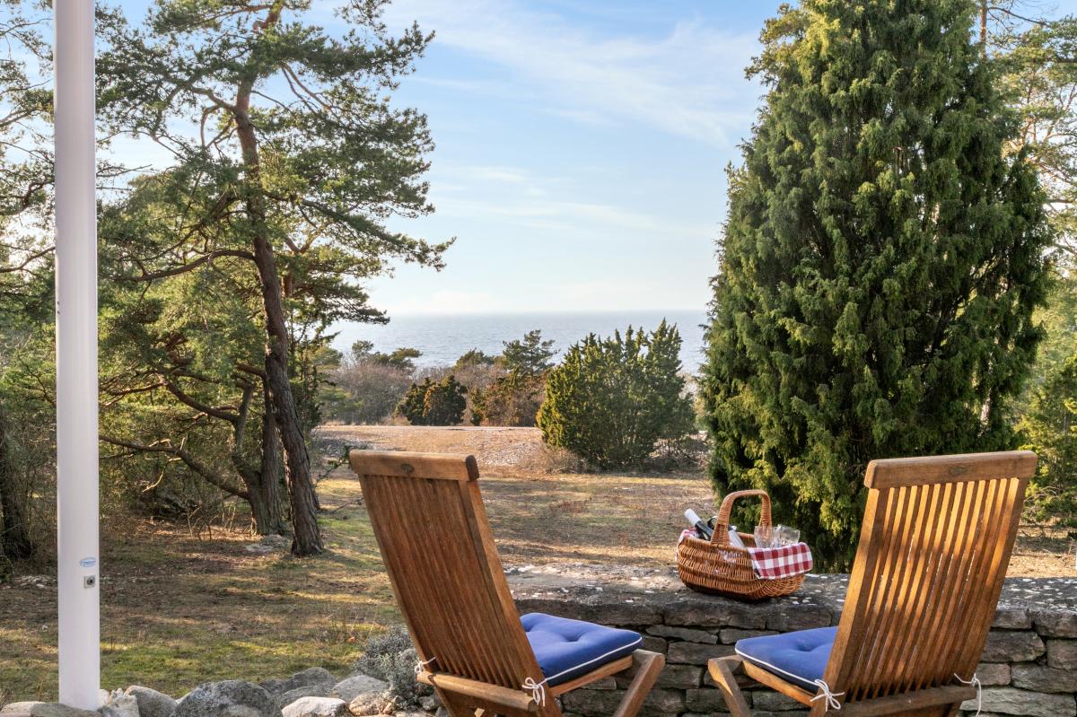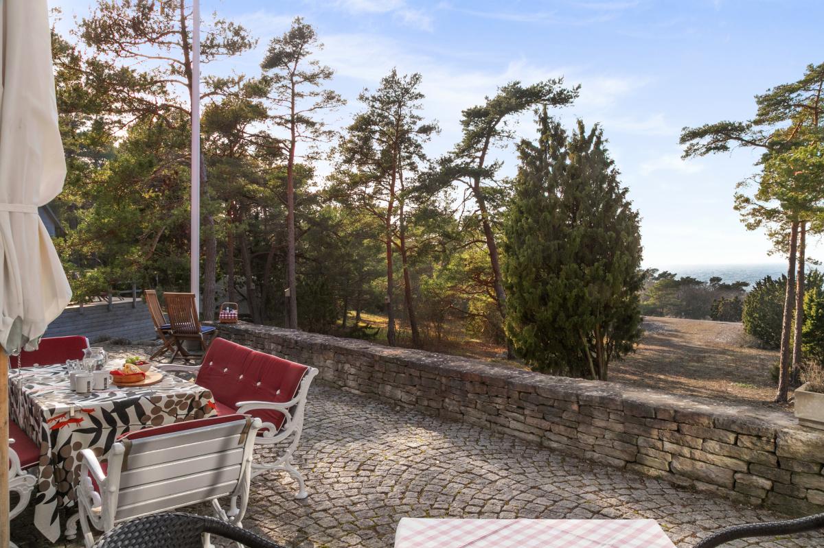 I husets vinkel med utgång från både kök och allrum finns en fint stensatt uteplats med härlig vy mot havet i väst. En vacker stenmur och en trevligt anlagd rabatt i det stora stenpartiet nedanför huset förgyller uteplatsen.