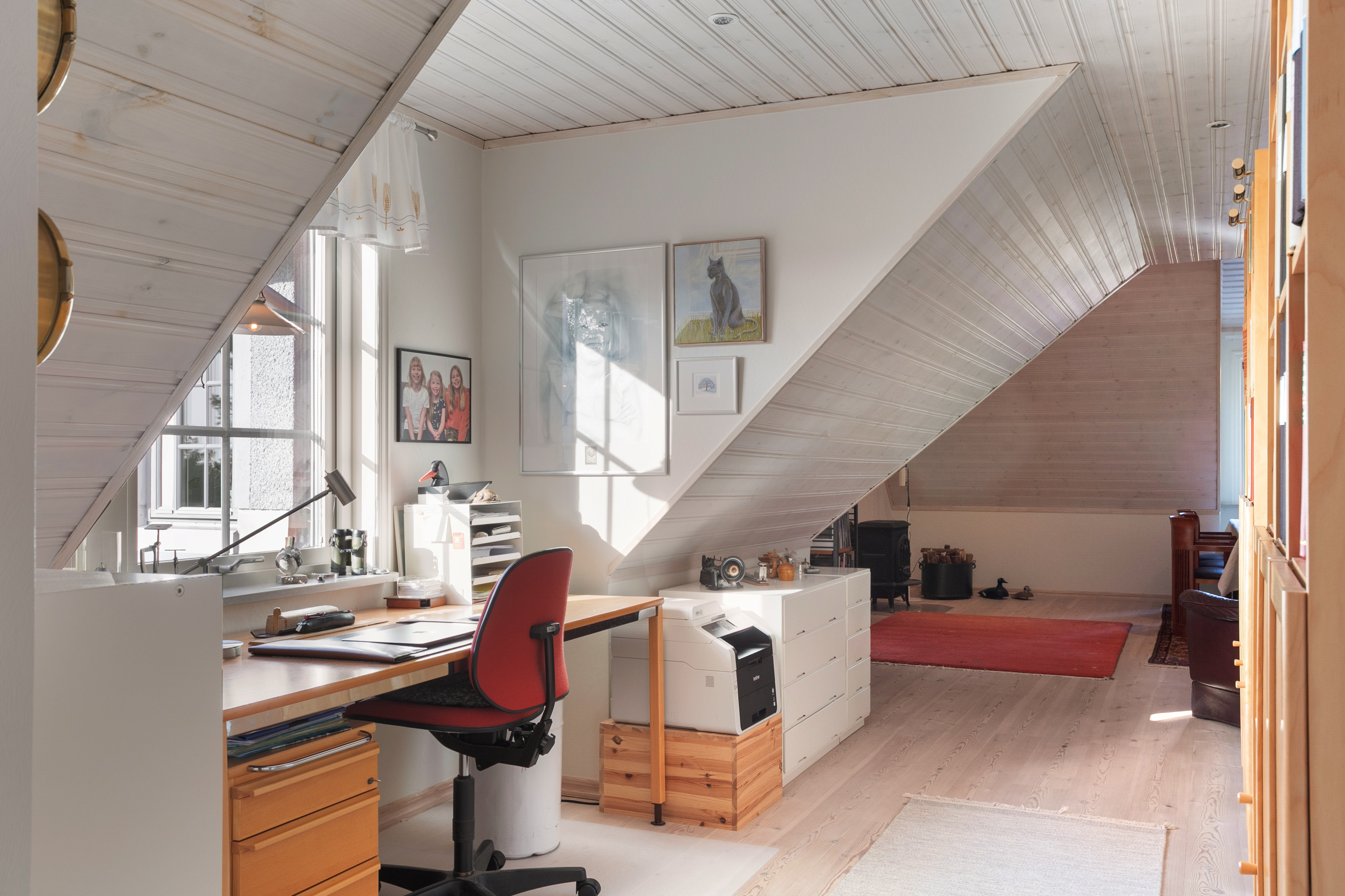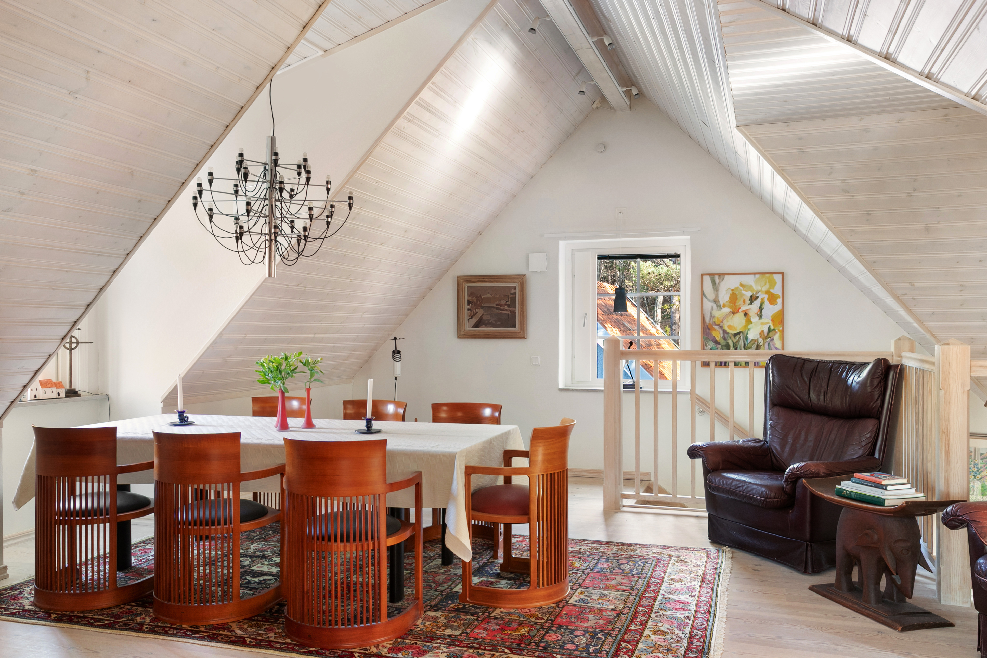Direkt uppe på övervåningen har du husets andra allrum. Rummet är för närvarande möblerat med en matsalsmöbel men kan även med fördel användas som tv-rum eller för umgänge. Rummet har bra ljusinsläpp och här finns också en järnspis av modell Jötul F3.