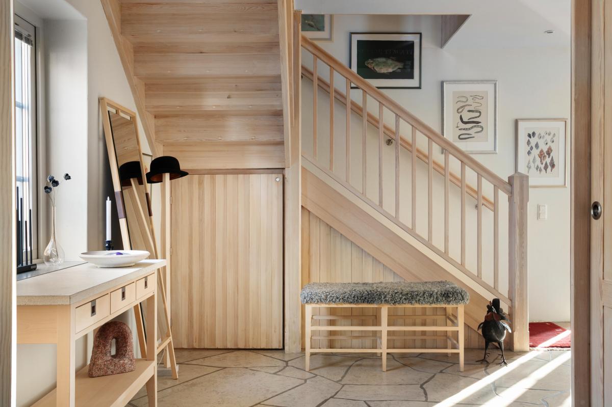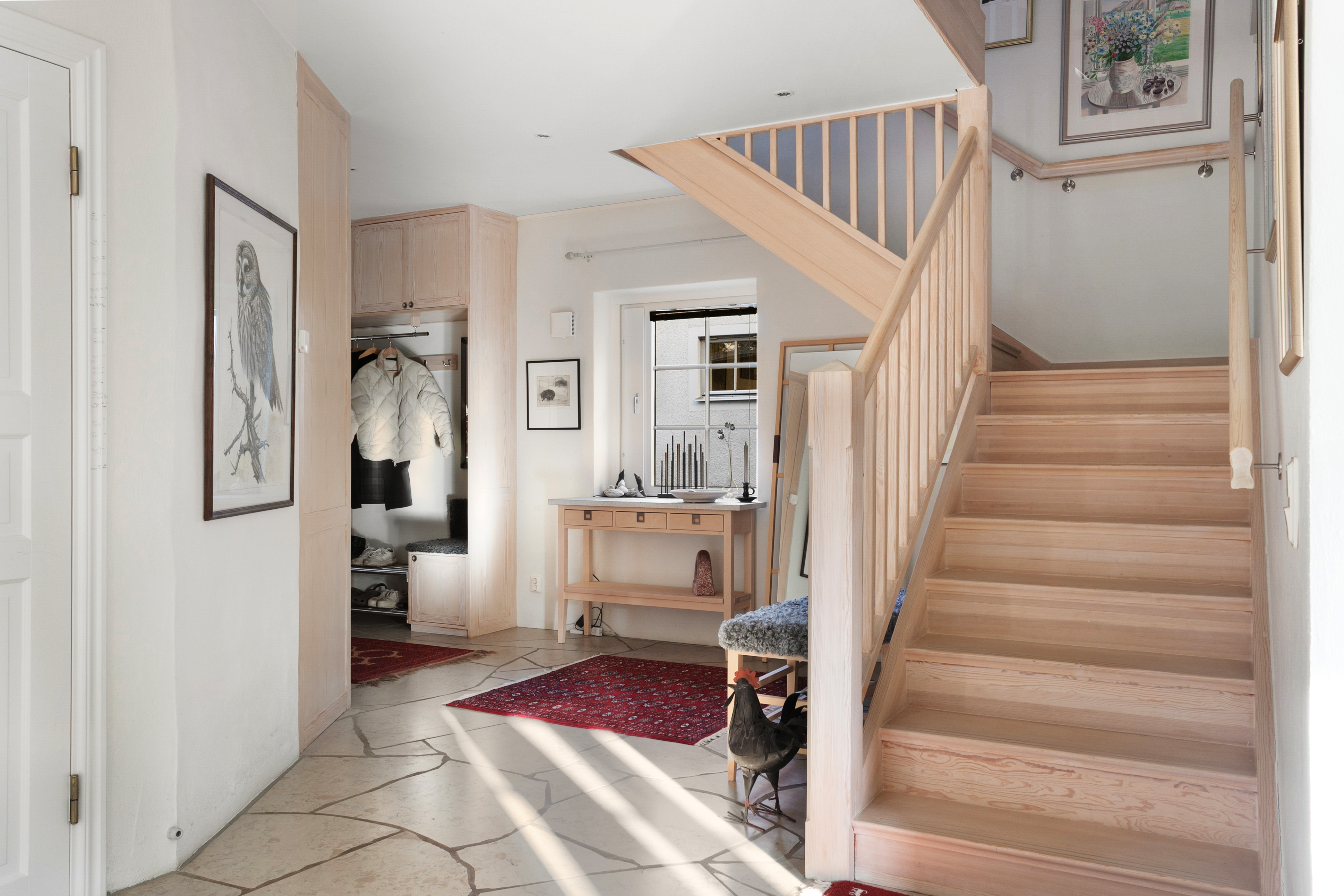 Rymlig och välkomnande hall med ljusa fina ytskikt och vackert kalkstensgolv med vattenburen golvvärme. Kapphänge samt utmärkt förvaring i garderober bakom dragdörrar och under trappan.