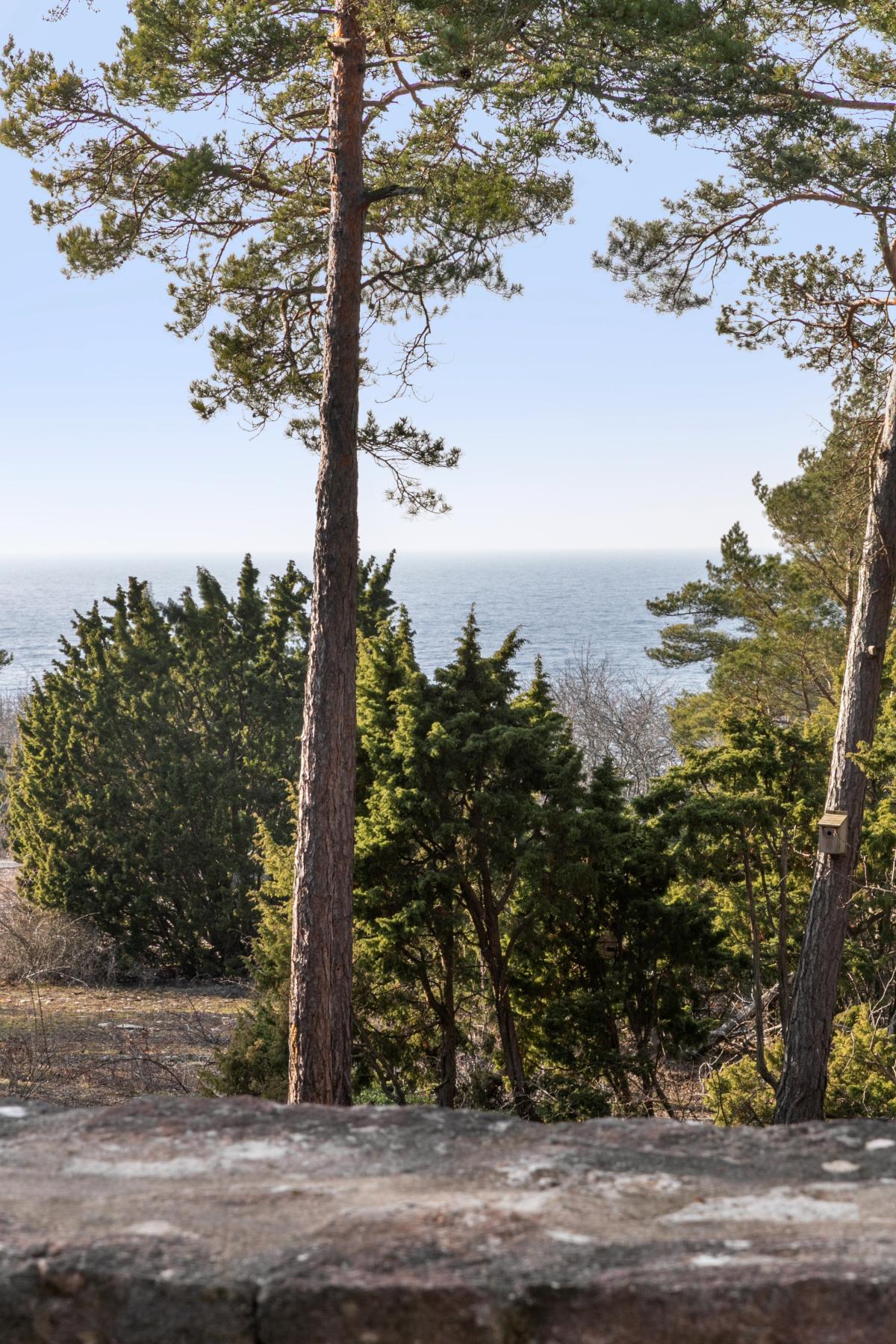 Lättskött naturtomt med naturliga nivåskillnader som innebär att byggnaderna och uteplatserna har en öppen och fri sikt ner mot havet. Uppvuxna träd och vackert stenparti med planteringar framför uteplatsen.