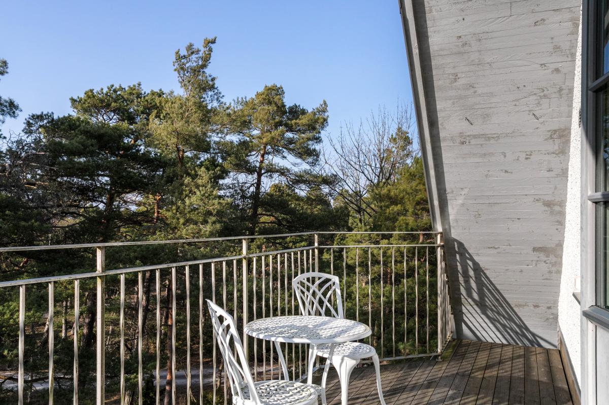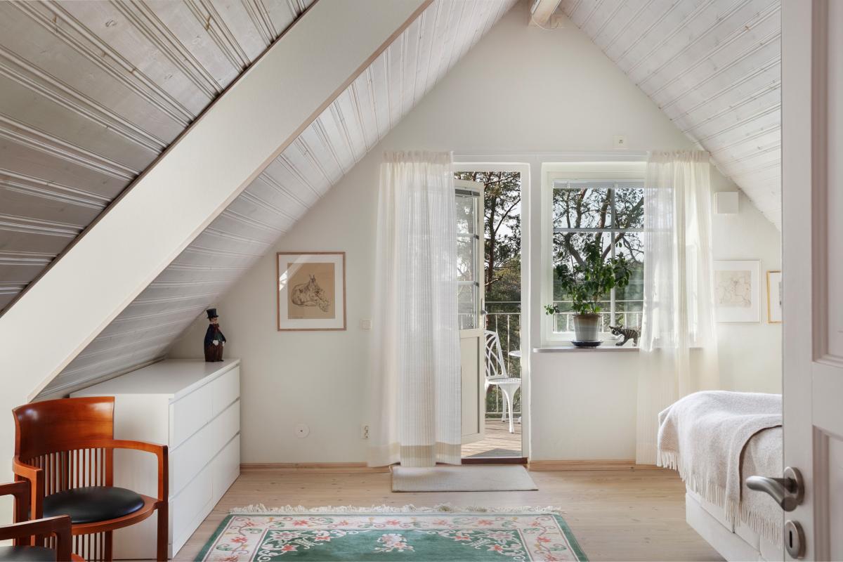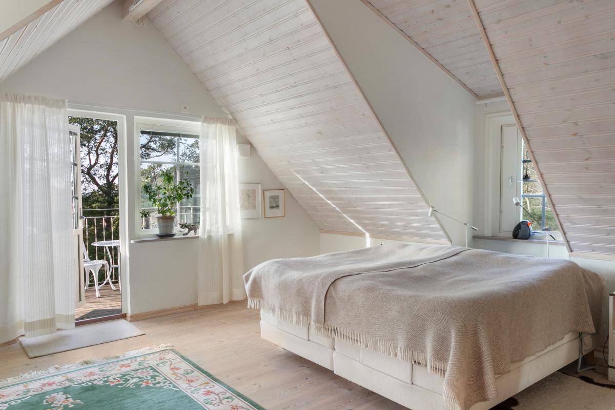 Husets största sovrum har fönster i tre väderstreck samt balkong mot havet.