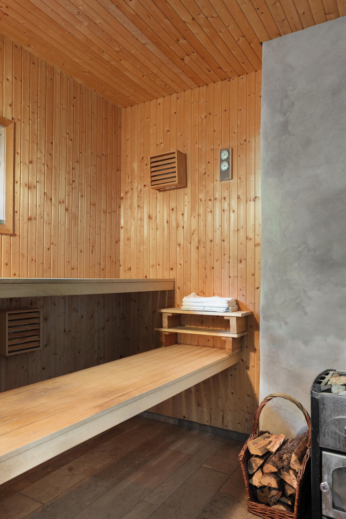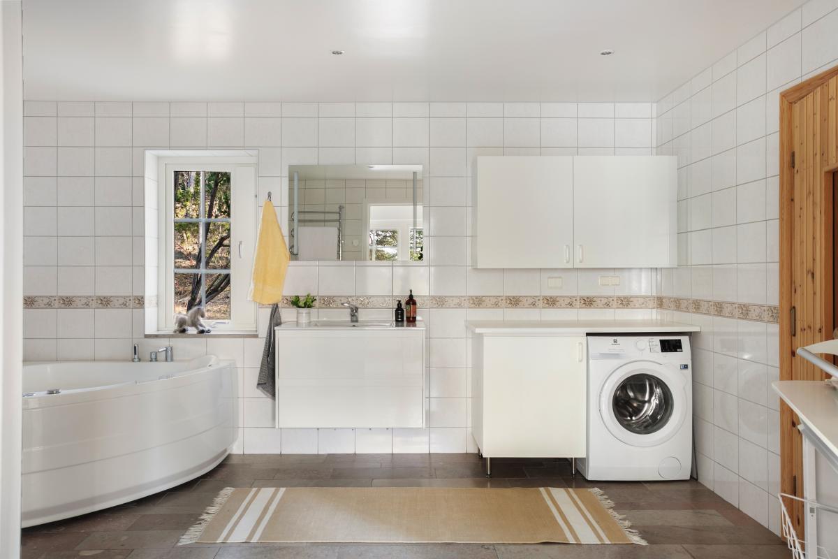 Stort generöst och helkaklat badrum med bubbelbadkar, separat duschutrymme samt vedeldad bastu. Badrummet har ett stort handfat med tvättkommod, handdukstork, skåp, tvättmaskin samt bänkskiva.