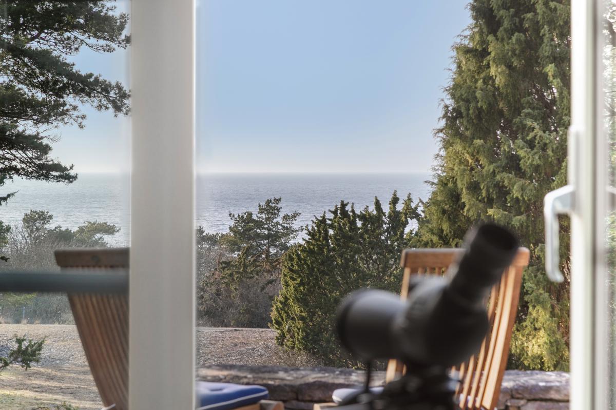 gästhuset har stora glaspartier mot havet