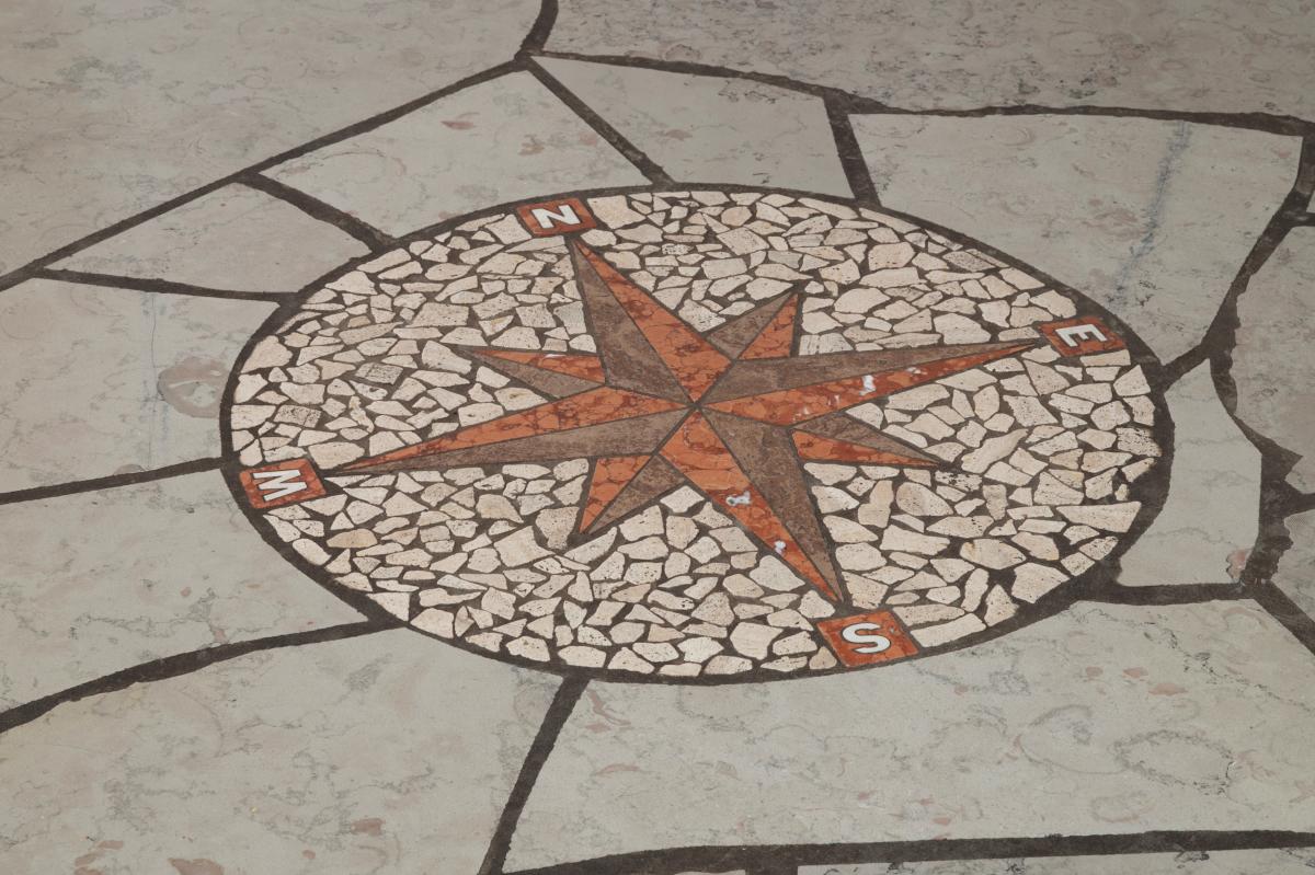hela entréplan har kalkstensgolv - här med kompass i hallen
