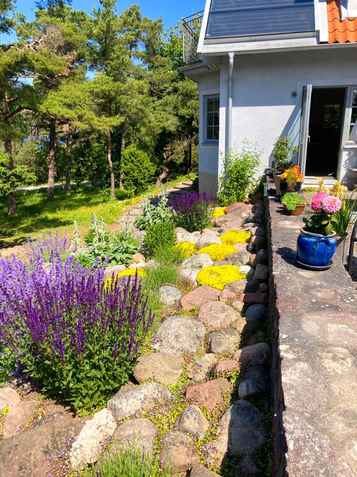 Säljaren har anlagt en fin rabatt vid det stora stenpartiet (sommarbild)